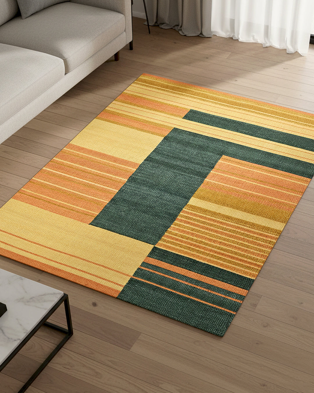 Front legs of sofa on the rug. Works beautifully in 2BHK living rooms across Indian metros.